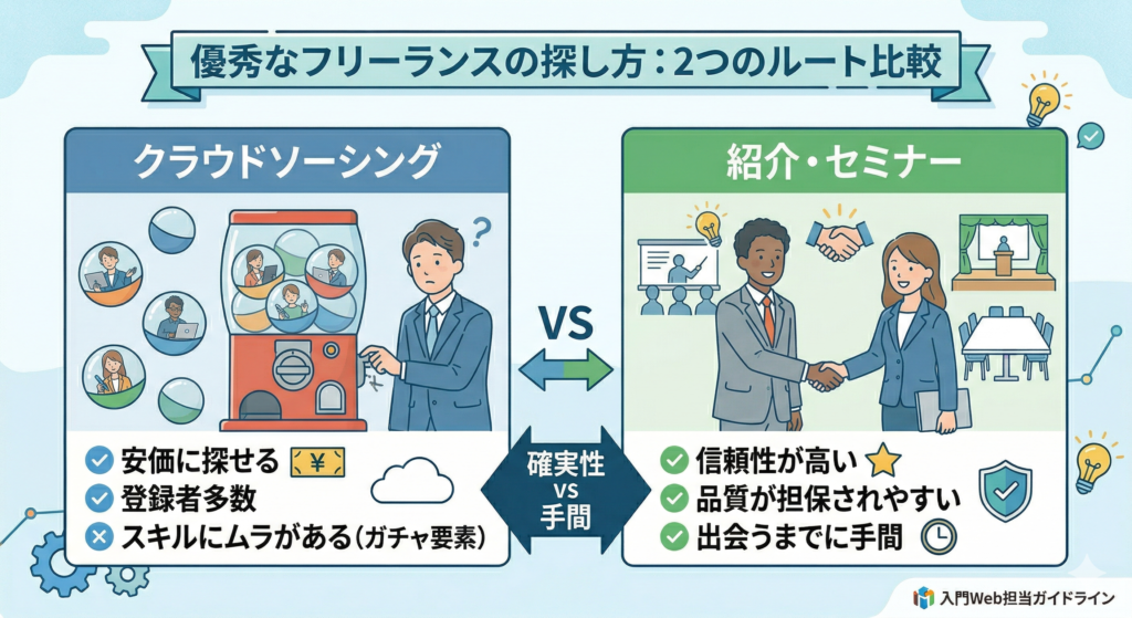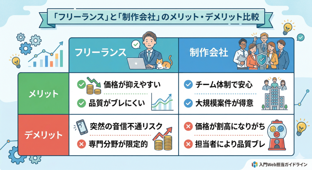 Web制作を外注する際、主な選択肢は「フリーランス」か「制作会社」の2つです。まずは、それぞれの強みと弱みを整理しましょう。