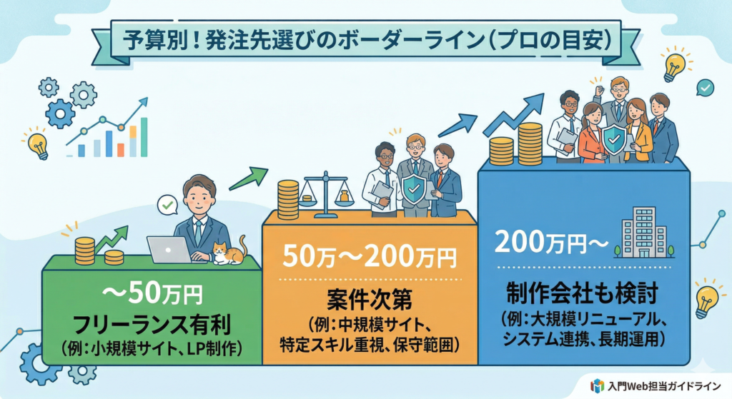 - 予算50万〜200万円: 案件の内容(デザイン重視か、システム重視かなど)によって最適な発注先が変わります。